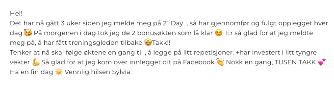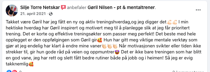 Jeg er kjempefornøyd med treningsprogrammet Restart2021. De mentale verktøy og videoene med program, der Gøril gjør hele økten med deg, var akkurat det som skulle til for at jeg har kommet meg ut av sofaen til både hjemmetrening og raske turer/jogg ute.