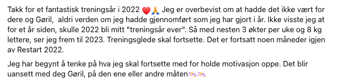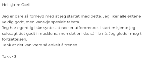 Tidligere var trening forbundet med smerte, både fysisk og psykisk, og nå gleder jeg meg til både løping og styrketrening! (hadde virkelig aldri trodd det!). Endringen har skjedd fordi Gøril har økt min bevissthet rundt Hvorfor jeg vil gjøre det - og hvordan, og hun har støttet meg underveis! Anbefales!!